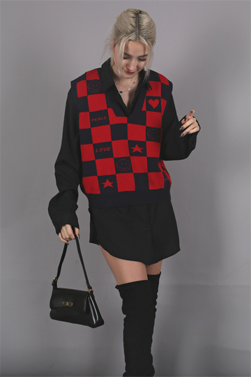 MDX Red V-Neck Checkered Regular Fit Women's Sweater - Huntersville