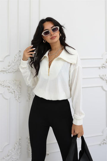 RYN Wholesale Wide Collar Zippered Ribbed Sweater Ecru - Moerdijk
