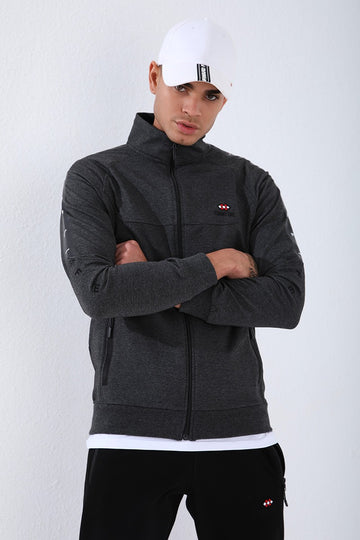 TMY Anthracite - Black Round Neck Striped Printed Standard Mold Cuffed Men's Tracksuit - 85150 - Fair Lawn