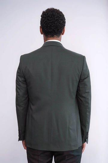 It is a suit jacket produced in green color, single button, double slit, three pockets and a slim fit pattern. This jacket with dot patterns has a pointed collar. The collar is designed in black. Inside, there is a plain, black, slim fit vest with a double breasted vest. This suit complements the combination of straight, black-colored fabric trousers with a comfortable fit. This three-piece suit model is a very stylish product.